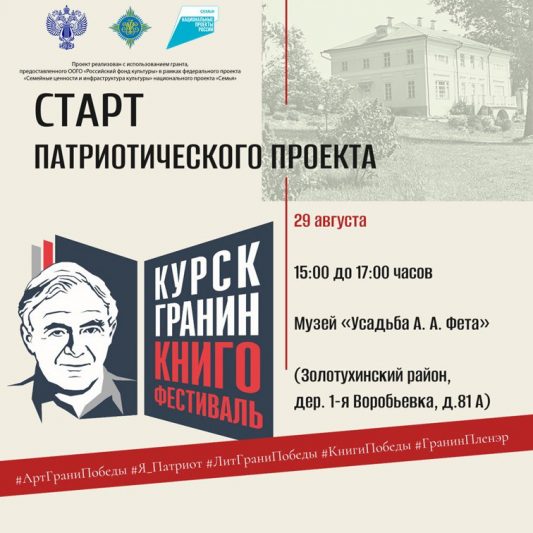 В Курской области в рамках федерального проекта «Семейные ценности и инфраструктура культуры» национального проекта «Семья» проведут первый патриотический фестиваль, который будет носить имя писателя-фронтовика, сценариста Даниила Гранина. #КурскГранинКнигоФестиваль стартует в 15.00 в музее-усадьбе Фета.