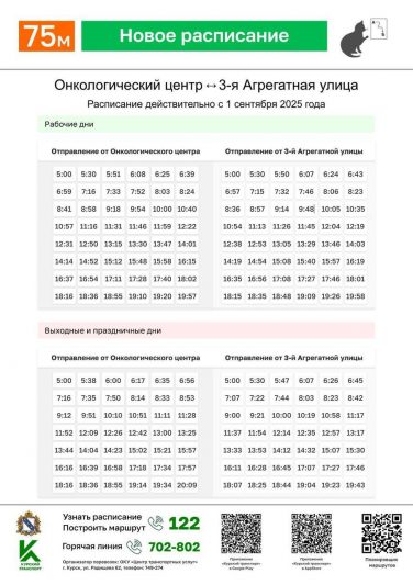 В Курске с сегодняшнего дня, 1 сентября, изменится расписание движения автобусов на маршрутах № 71м «ГКЦ «Лира» — 2-я Агрегатная улица» и № 75м «Онкологический центр — 3-я Агрегатная улица».