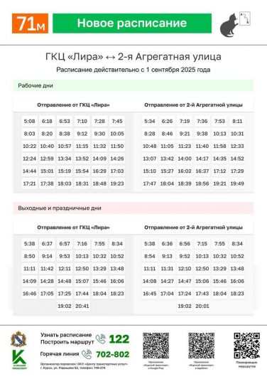 В Курске с сегодняшнего дня, 1 сентября, изменится расписание движения автобусов на маршрутах № 71м «ГКЦ «Лира» — 2-я Агрегатная улица» и № 75м «Онкологический центр — 3-я Агрегатная улица».