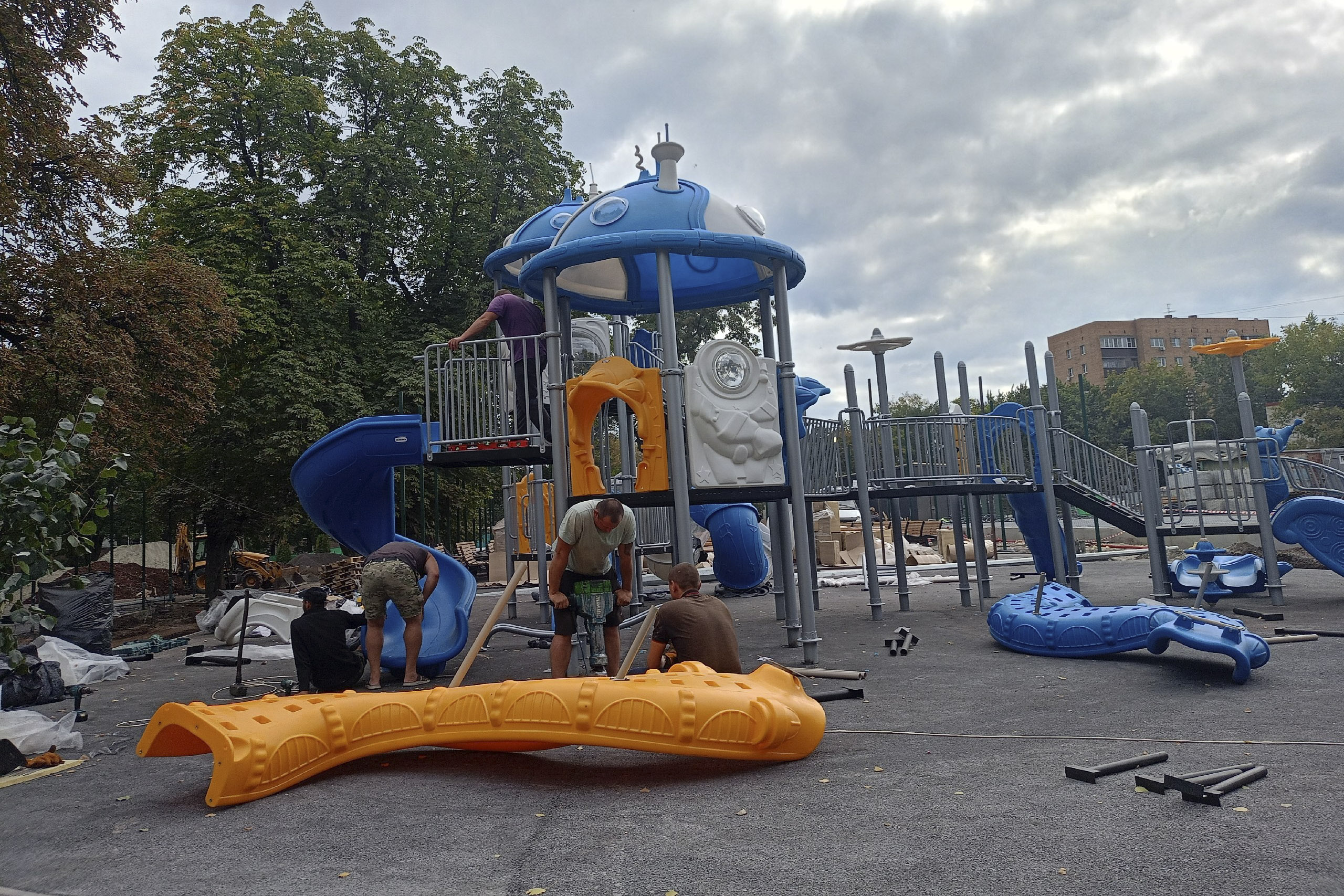 Обновлены волейбольные и баскетбольные площадки. Футбольное поле осталось на прежнем месте. Спортивные объекты предусмотрены для разных видов спорта. В парке установлен современный интерактивный экран, ребята смогут посмотреть мультфильмы, образовательные программы, профилактические ролики. Обустроена площадка для концертов, театрализованных представлений, здесь будут выступать юные артисты из Дворца пионеров и школьников, образовательных учреждений, школ искусств.