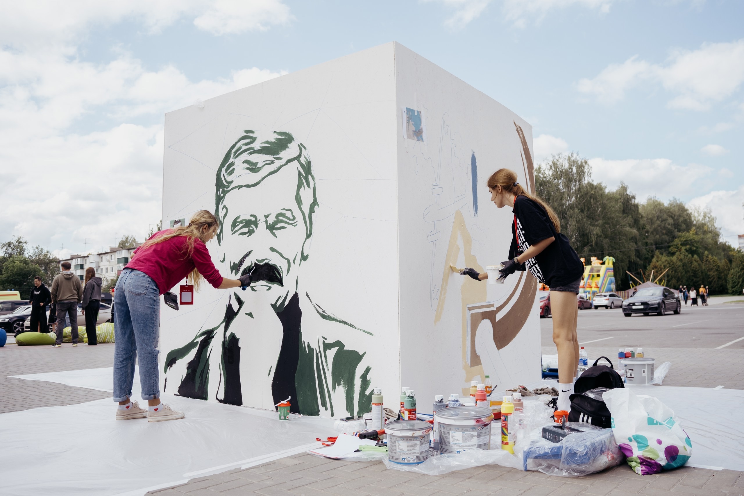 Ещё одно направление – «Стрит-арт». Участникам фестиваля предложили расписать огромный куб. Каждая его сторона так или иначе посвящена нашему региону: одно из полотен Александра Дейнеки, портрет Вячеслава Клыкова, изображение на тему 1000-летия Курска в цветовой гамме Казимира Малевича, а также мультяшный хоккеист Бориса Дёжкина.