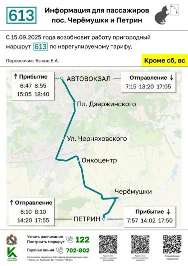 В Курском районе вновь будет ходить пригородный автобус на Черёмушки и Петрин. Маршрут №63 возобновит свою работу с 15 сентября и будет отправляться с площади Дзержинского. Обслуживать пассажиров он будет по нерегулируемому тарифу.