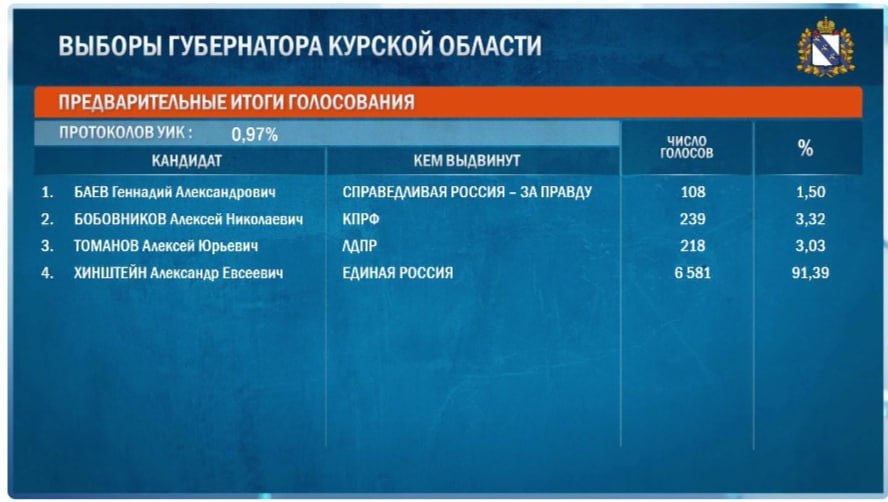 По данным ЦИК России, после обработки 0,97% бюллетеней лидирует врио губернатора региона, кандидат от партии «Единая Россия» Александр Хинштейн.