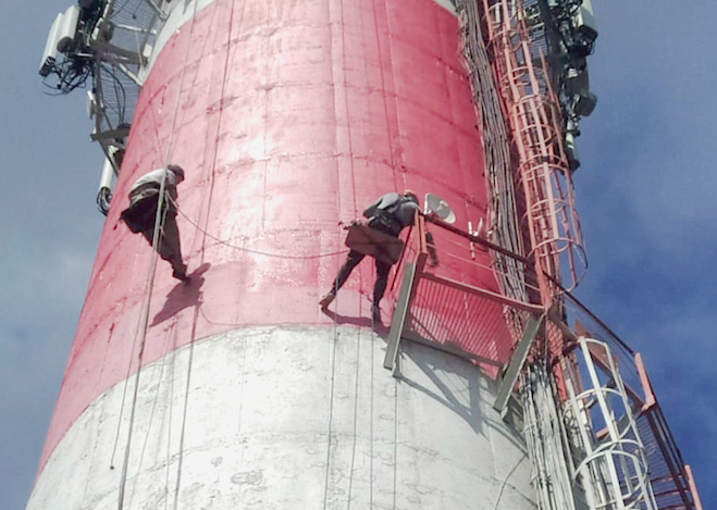 В Курске началась подготовка к покраске дымовой трубы ТЭЦ-4. Промышленные альпинисты уже ведут штукатурные работы. Впереди — мойка конструкции и её окраска.