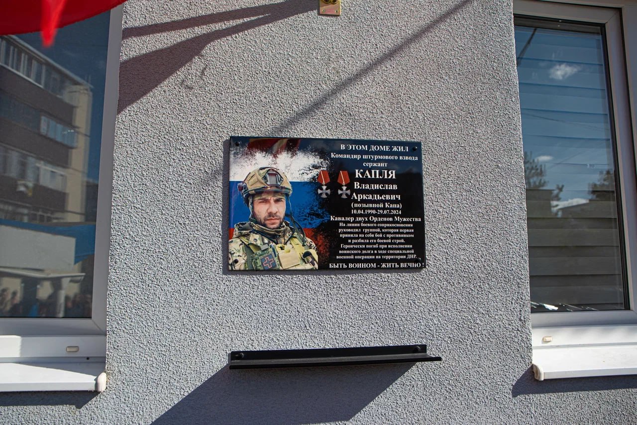 На фасаде дома по улице Краснознаменной, 9а, открыли мемориальную доску в память об участнике СВО Владиславе Капле. Он жил здесь с мамой и братьями и окончил профессиональный лицей № 27 города Курска.