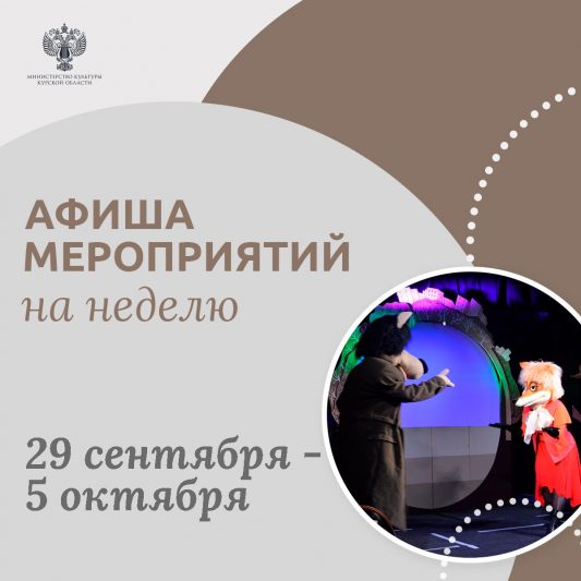 1 октября в 19.00 в Курской филармонии откроется 90-й концертный сезон. В рамках программы Министерства культуры РФ «Всероссийские филармонические сезоны» выступит Симфонический оркестр под управлением Игоря Сукачева и пианиста Александра Клочко (Москва). Также в 19:00 в Дирекции по кинопоказу и проведению культурно-массовых мероприятий пройдет проект «Киноквартирник» с показом фильма «Дневник директора школы».