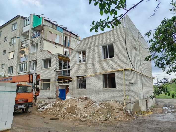 На данный момент завершены работы по восстановлению наружных стен, внутренних перегородок и стяжки кровли, а также межэтажных перекрытий. В процессе находятся работы по укладке кровельного покрытия, половина работ уже сделана, и установке внутренних перегородок, работа выполнена на 90 процентов. Также установлены 11 оконных блоков, выполнена электропроводка в 5 квартирах, и начат монтаж фасадного газопровода.