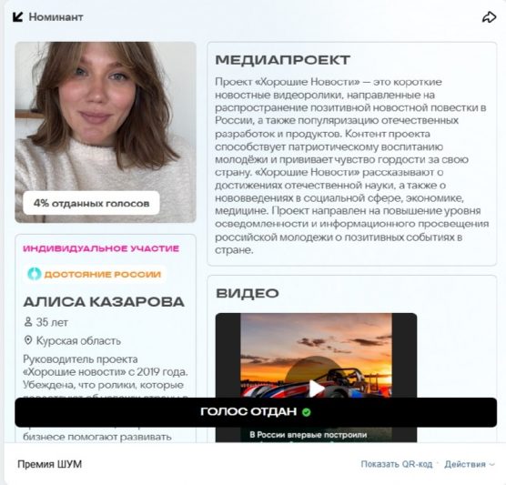 Всероссийская молодёжная премия «ШУМ» в области медиа и журналистики объявила финалистов, среди которых выделяется талантливый медиаспециалист из Курской области — Алиса Казарова.