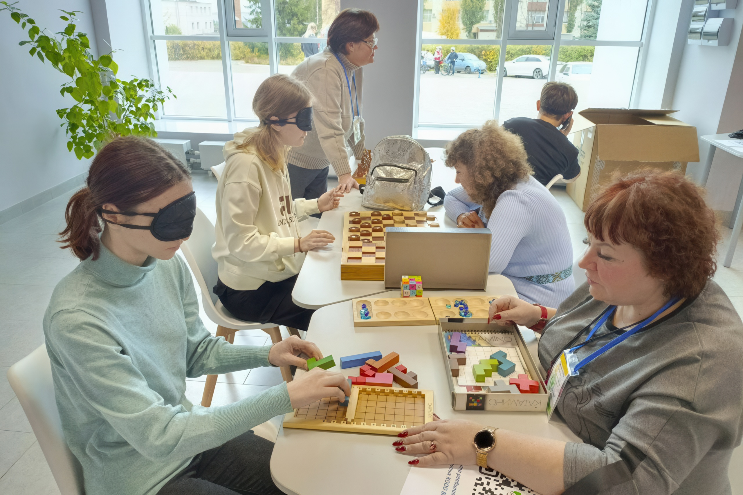 Гостей ждали интерактивные площадки: можно было поиграть в «слепые» шашки и дартс, прокатиться на велотандеме, где за рулём сидит зрячий человек, а на втором сидении – инвалид по зрению, потрогать рельефные буквы Брайля, попробовать пользоваться телефоном без экрана, походить с белой тростью и даже поучаствовать в квесте «Всё на ощупь».