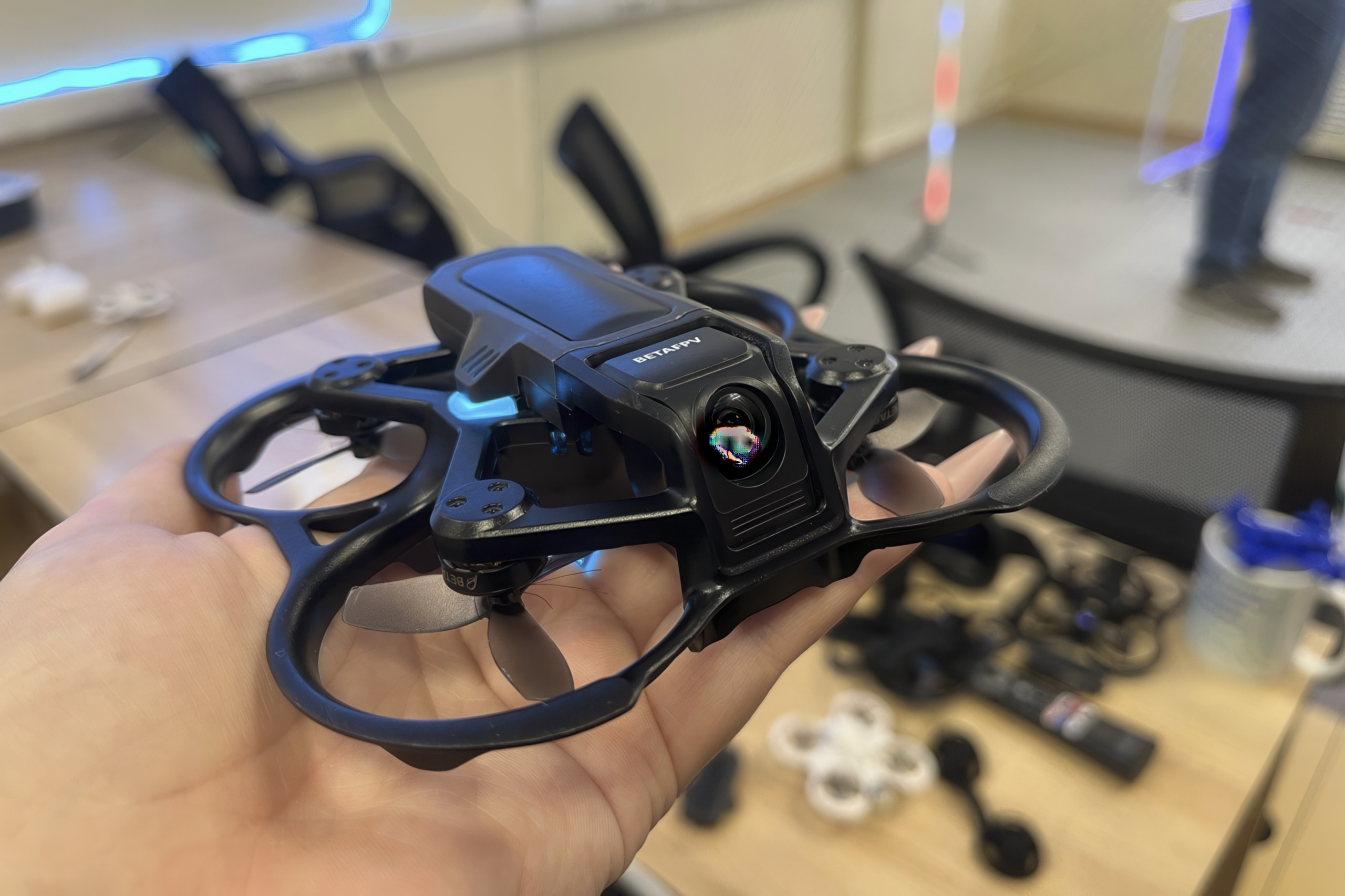 А вот во втором этапе мы вышли на настоящую гоночную трассу. Кстати, я представляла себе дроны для гонок несколько навороченными и крутыми, а они оказались размером с небольшую ладонь, но от этого не менее мощными. От обычного квадрокоптера с четырьмя пропеллерами их отличает только маленький размер и наличие защитных осей для безопасного использования в помещениях.