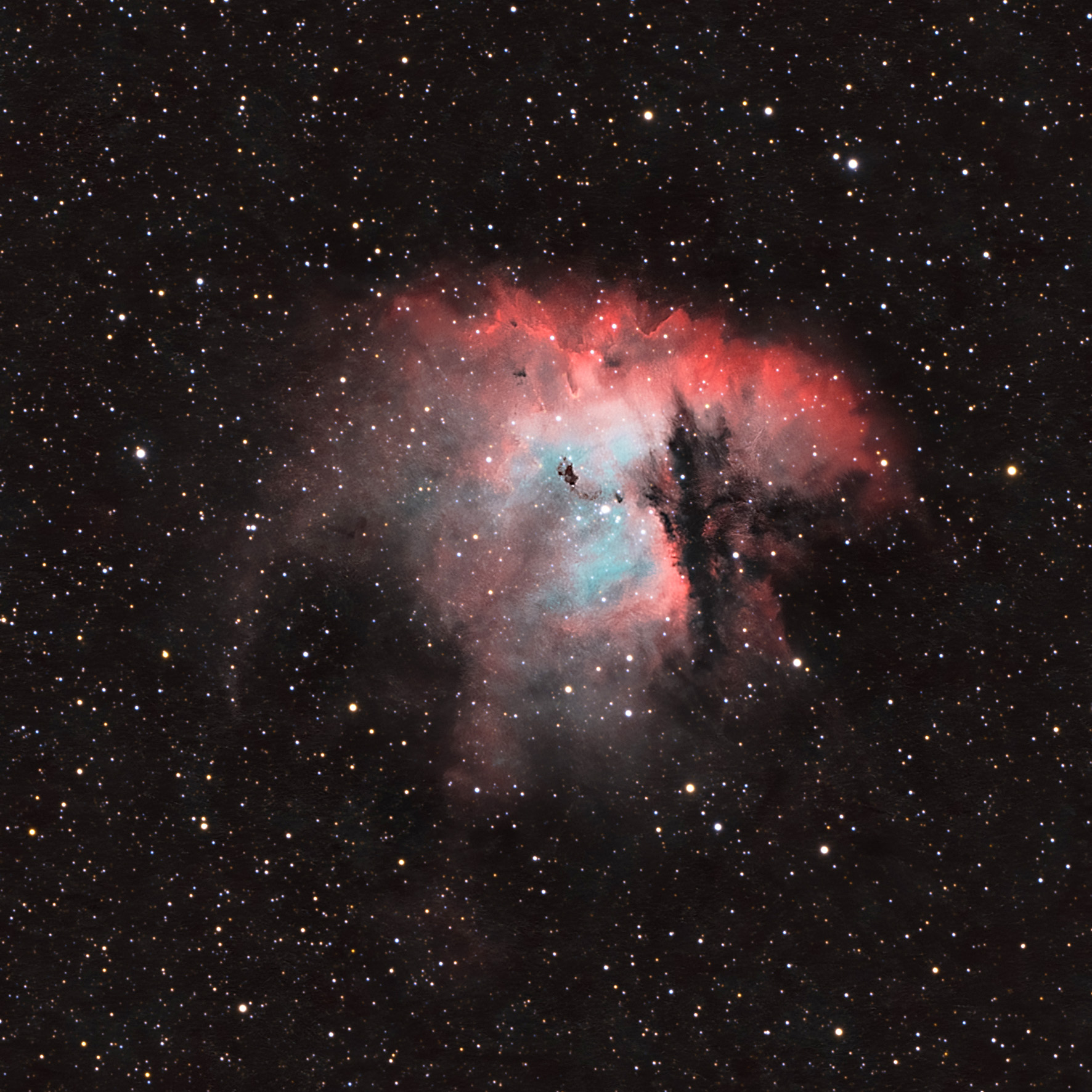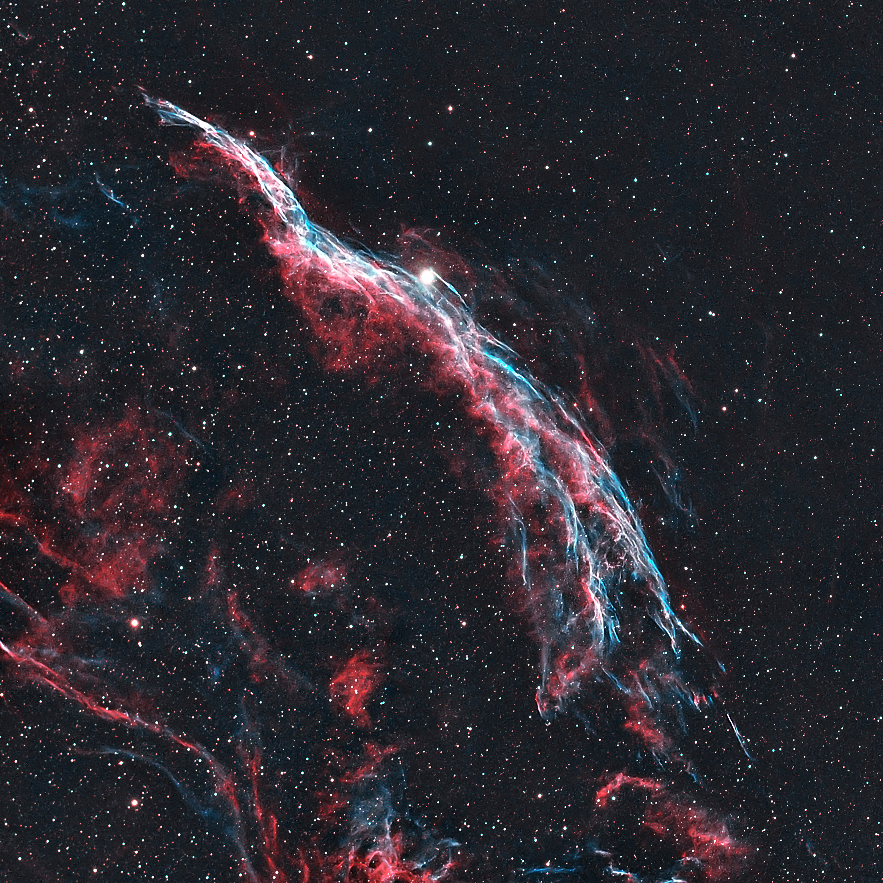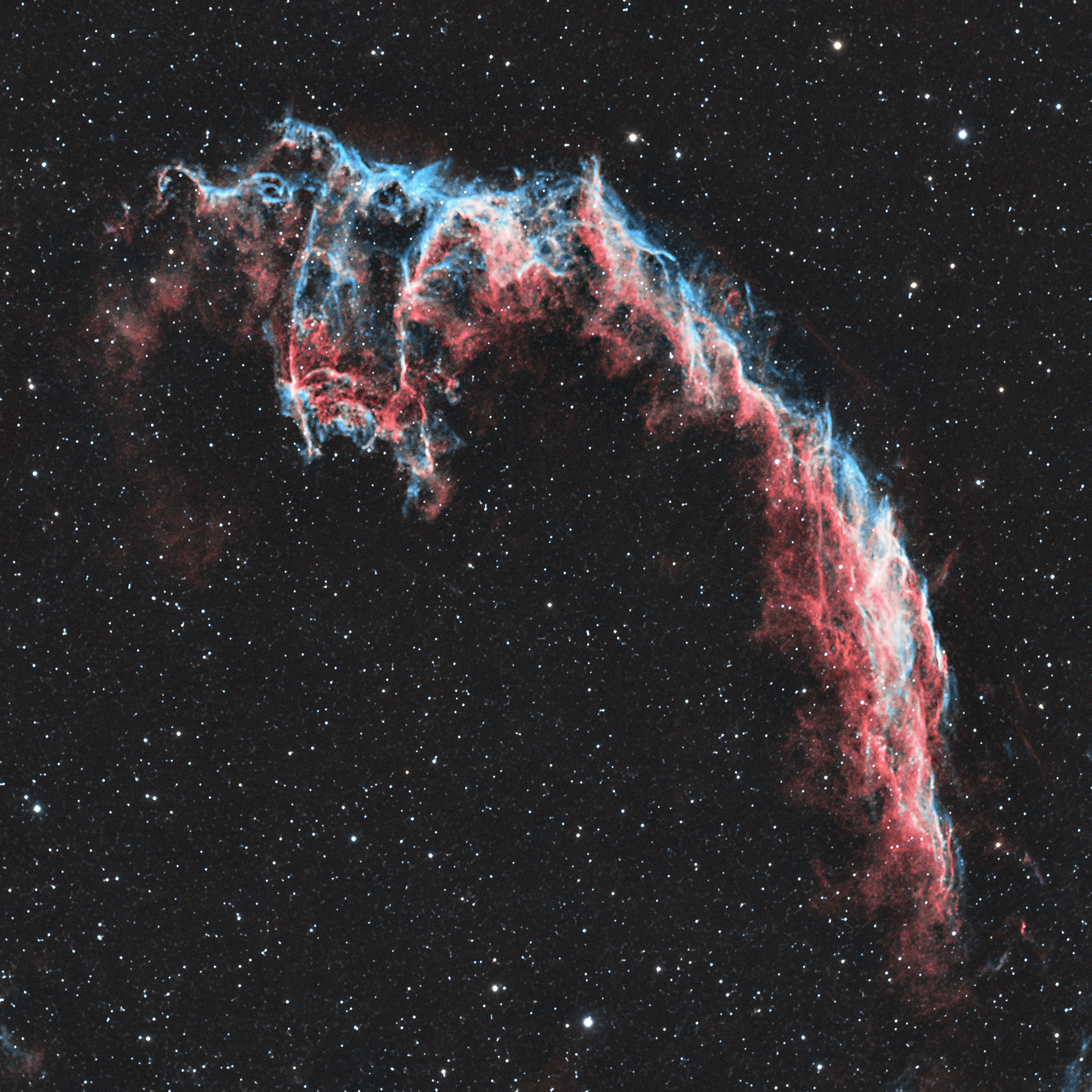 Этой осенью Павлу Абакумову удалось запечатлеть туманность Летучая мышь, которая входит в состав туманности Вуаль. Это не просто облако космического газа, а часть гигантского остатка сверхновой звезды, которая взорвалась 5000–8000 лет назад, свет от того катаклизма шёл до Земли около 1400 световых лет. Для создания итогового изображения курянин сделал 30 снимков с длительной выдержкой по 3 минуты каждый. После отбраковки неудачных кадров в финальную фотографию вошло 21 изображение, что в сумме дало 63 минуты чистого времени накопления света.