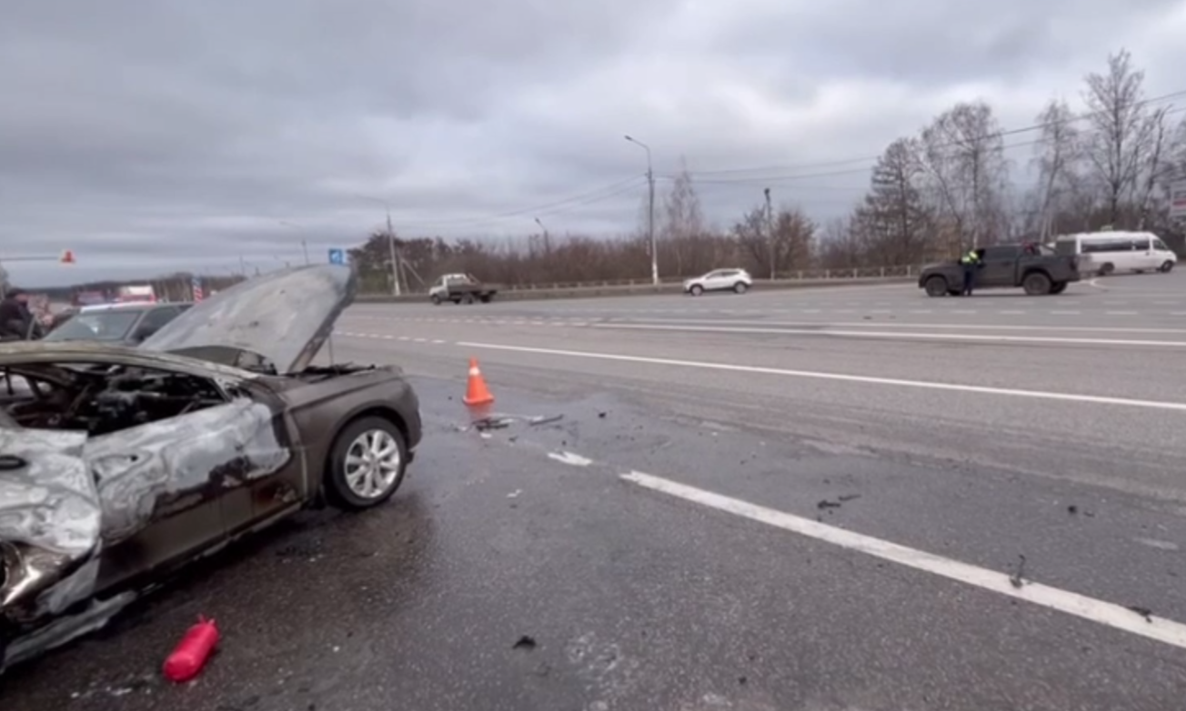На 521 км автодороги М-2 «Крым» столкнулись два автомобиля, в результате чего один из них загорелся.