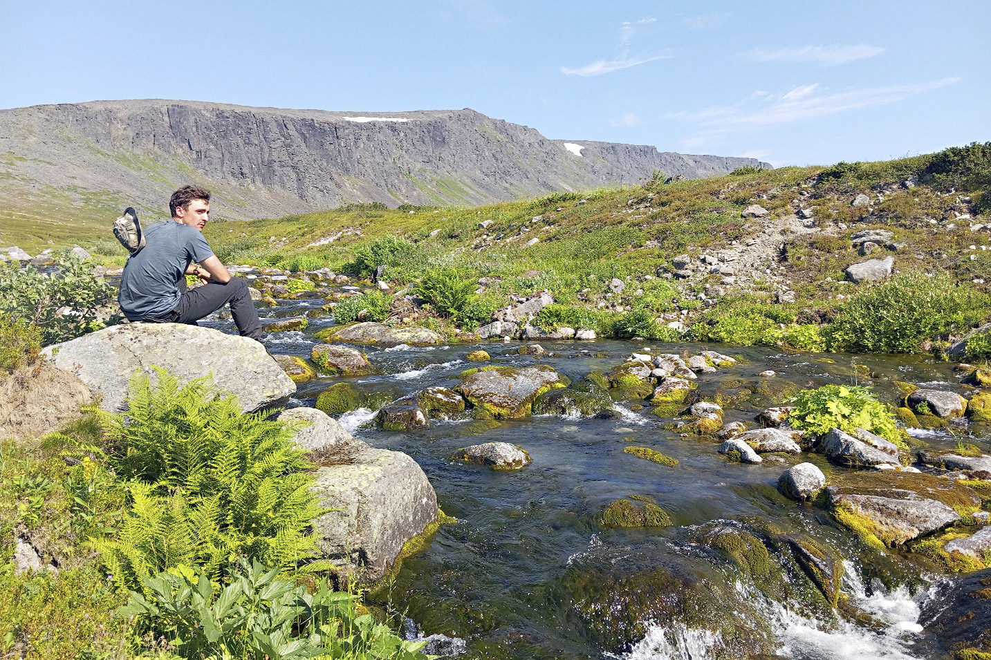 Те, у кого они были, вооружились треккинговыми палками. Первую пешую «разминку» длиной 20 км туда и обратно на перевал Сенгисчорр (к мудрёным географическим обозначениям скоро не привыкнешь) высотой чуть выше 1100 метров выдержали не все. Может, с непривычки устали. Времени на самом деле было много – хотя вернуться нам в лагерь по темноте так или иначе не грозило. На то он и полярный день: 18,5 часов светло, в остальное время – молочные сумерки. И всё же группа хотела назад. Я побежал предупредить двух далеко ушедших вперёд ребят, да так и остался с ними.