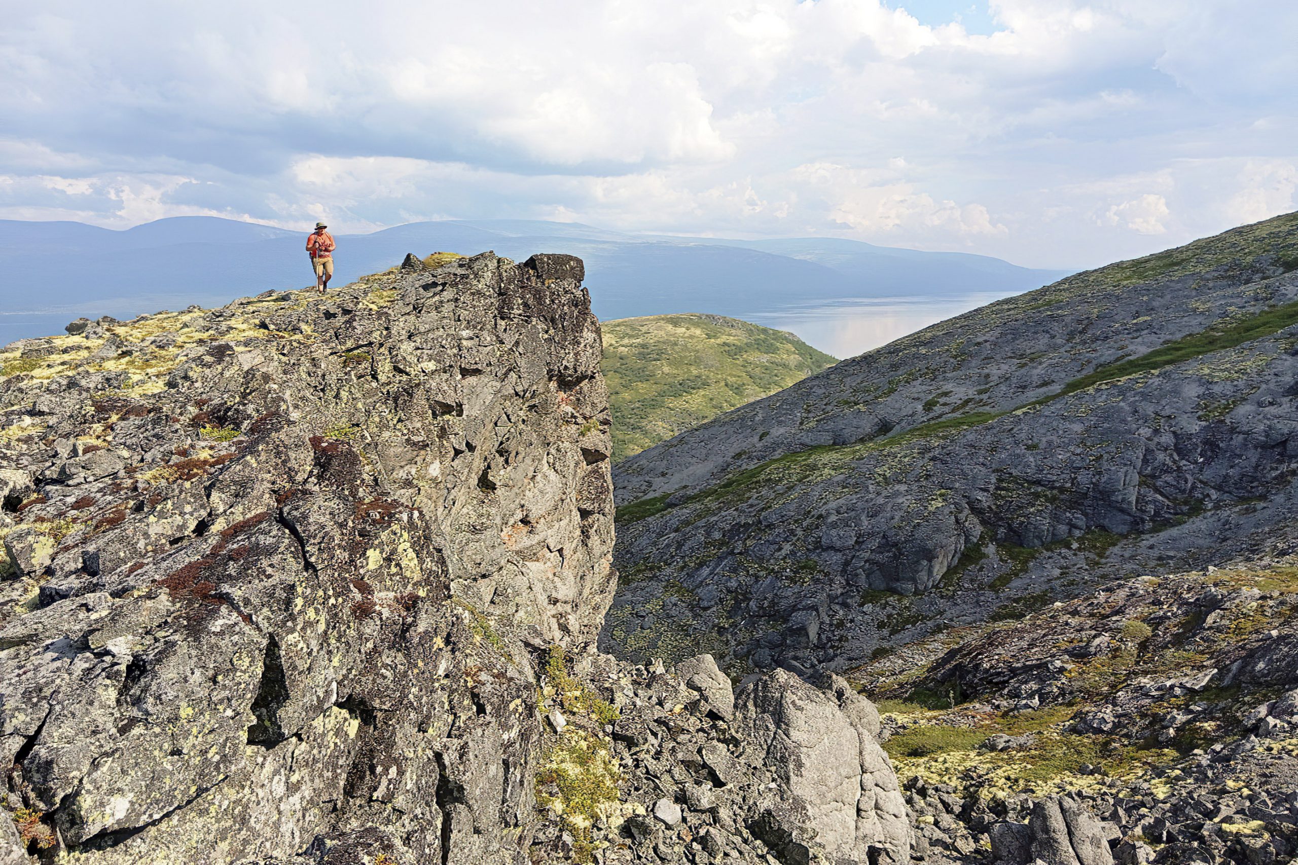 В темпе, чтобы успеть на спуске догнать остальных, мы дошли до озера Сенгисъявр, которое, собственно, и было целью маршрута. Оно терялось в глубине 300-метровой пропасти. На вершине мы оказались не одиноки – вдали минут десять мелькал северный олень. Перекусывал ягелем, которого под ногами росло сколько угодно и разных видов. А перед этим наши видели росомаху. Единственное, что мы пропустили, так это обеденный перекус, но ребята о нас не забыли, оставив на тропе заботливо сложенные пирамидки бутербродов из колбасы и сыра.