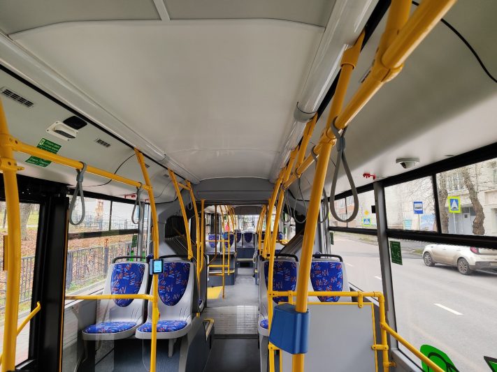 Перевозить «гармошка» может до 150 пассажиров, одно место специально оборудовано для маломобильных граждан. В салоне есть разъёмы для зарядки гаджетов и кондиционер.