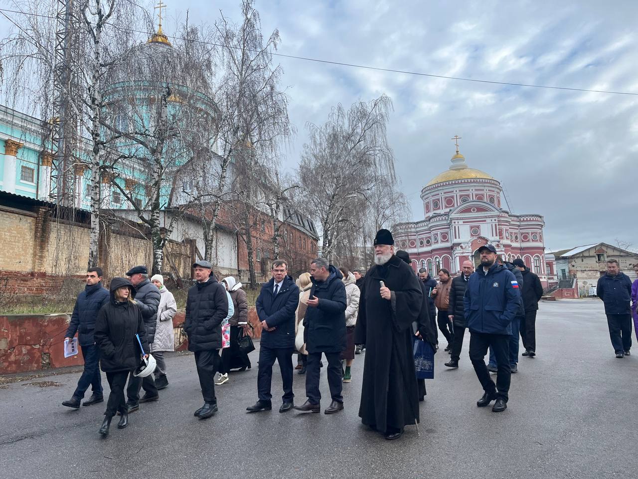 Маршрут начался с посещения Знаменского собора, где идут масштабные ремонтные работы, и Воскресенского храма, который уже восстановлен полностью. Митрополит Герман напомнил, что на старых фотографиях у храма было две колокольни. Он отметил, что шанс вернуть вторую колокольню всё ещё существует.