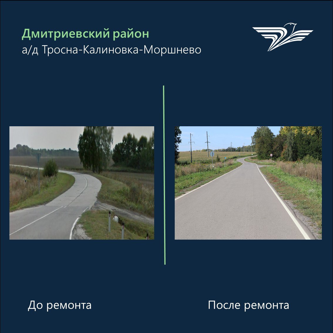В Дмитриевском районе завершили ремонт участка автодороги «Тросна–Калиновка» – Моршнево длиной 7,7 км. Работы провели по национальному проекту «Инфраструктура для жизни».