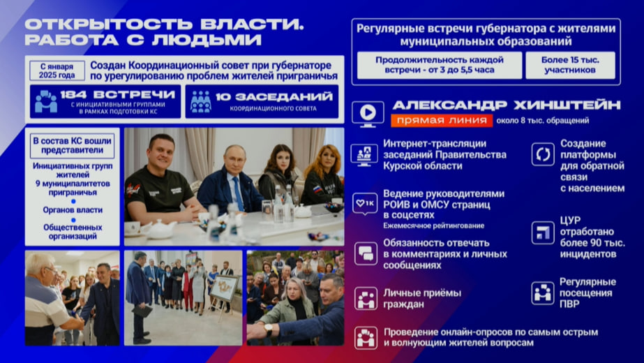 «Открытость власти в сегодняшних условиях – это просто неотъемлемая часть нашей работы. Это просто требование времени. И, к сожалению, наблюдаю большой дефицит общения со стороны жителей, со стороны курян. Понимаю, что коммуникации эти не были выстроены должным образом. Это – одна из ключевых задач, которую ставил передо мной президент. Вот ровно год назад, день в день – 5 декабря 2024 года, когда предложил возглавить регион, – и я старался весь этот год действительно максимально быть открытым с людьми. Самые разные форматы у нас за это время были реализованы, запущены. Начиная от общения в социальных сетях, которые должны вести теперь все должностные лица, члены правительства, главы местного самоуправления. Они должны не просто вести, но в обязательном порядке отвечать. И завершая таким форматом, как встречи с жителями. При этом встречи были действительно прямые, открытые, без премодерации, без заранее розданных вопросов и ответов, без ограничения желающих прийти. Я за этот год не помню ни одной встречи с людьми, которая продлилась бы меньше чем два с половиной часа. Рекорд был, кажется, пять с половиной часов или даже шесть», – подчеркнул Александр Хинштейн.
