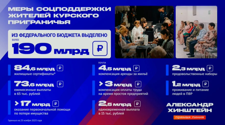Врио губернатора Курской области Александр Хинштейн во время «Прямой линии» рассказал о мерах государственной поддержки, оказанных региону в 2025 году. Одной из главных тем стала помощь жителям приграничных территорий, многие из которых вынуждены были покинуть свои дома.