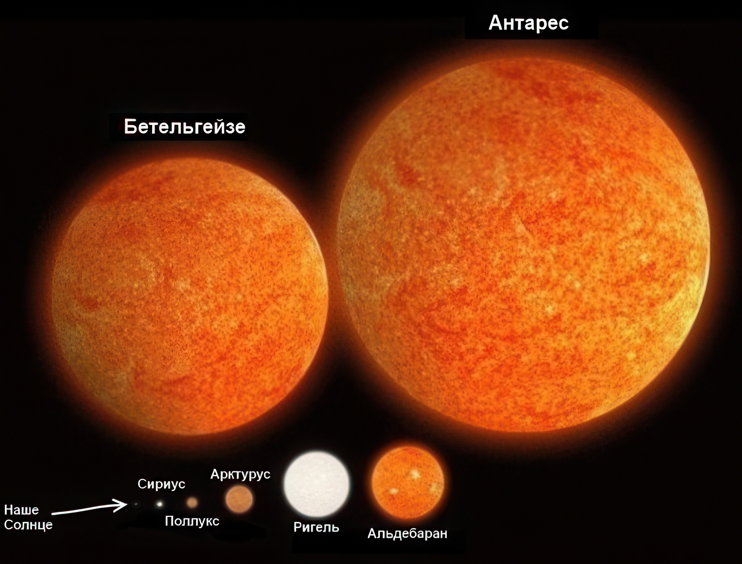 Диаметр Бетельгейзе – около 1000 солнечных радиусов. Если бы она заменила Солнце, её поверхность достигала бы орбиты Юпитера.