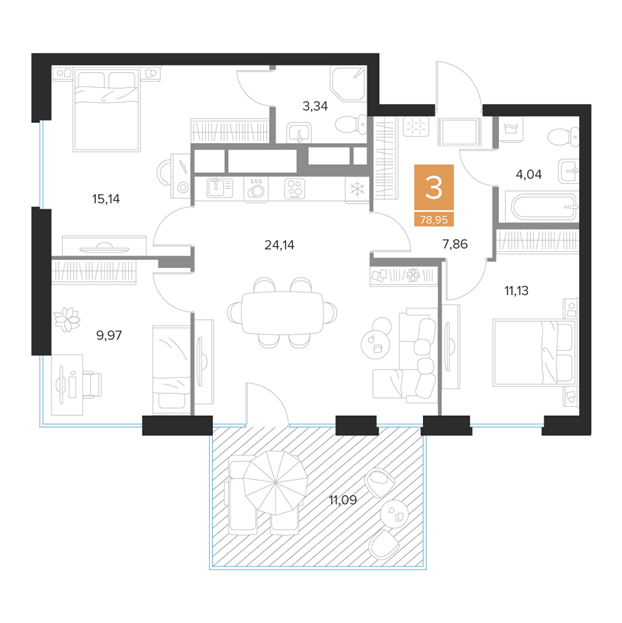 Пример планировки квартиры с террасой в парковом квартале «Чувства»