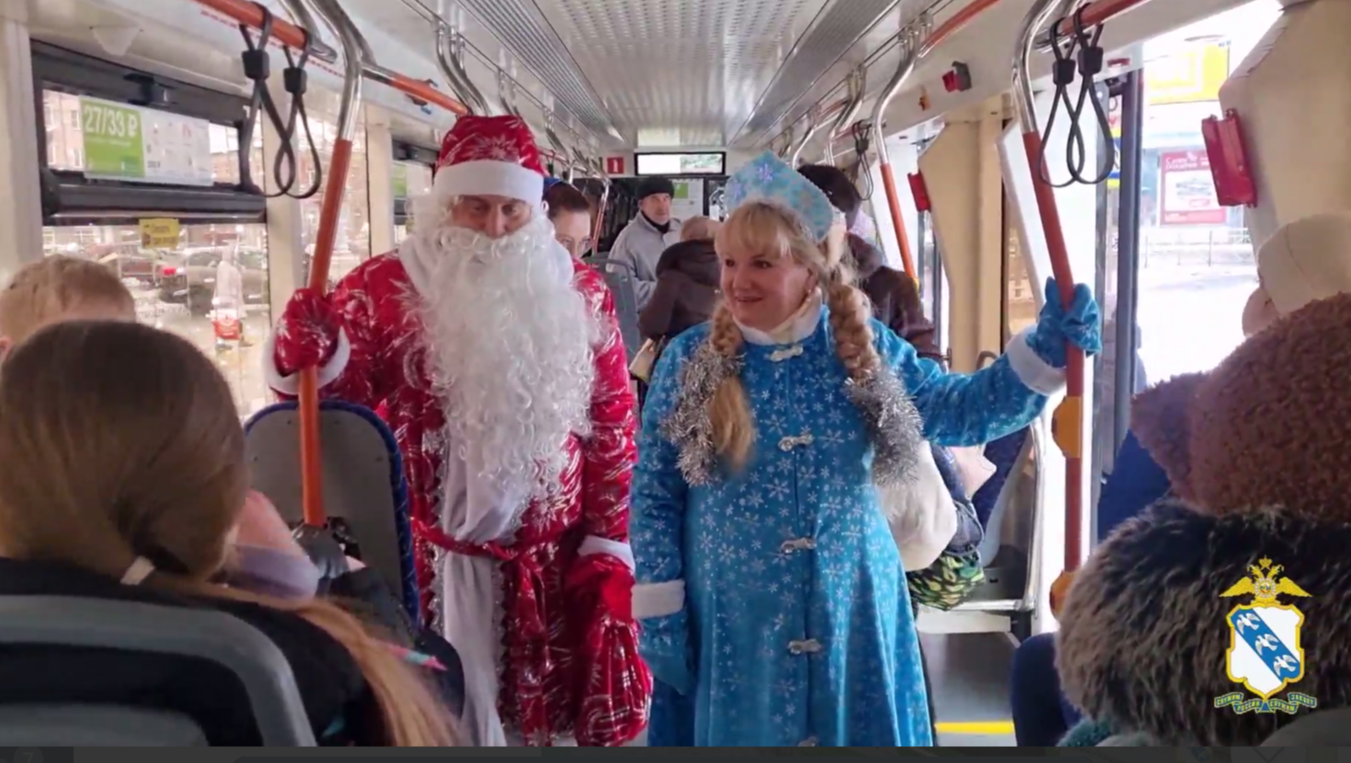 Акция «Полицейский Дед Мороз» превратила обычный маршрут трамвая в праздничный квест с викториной, экскурсией и подарками.