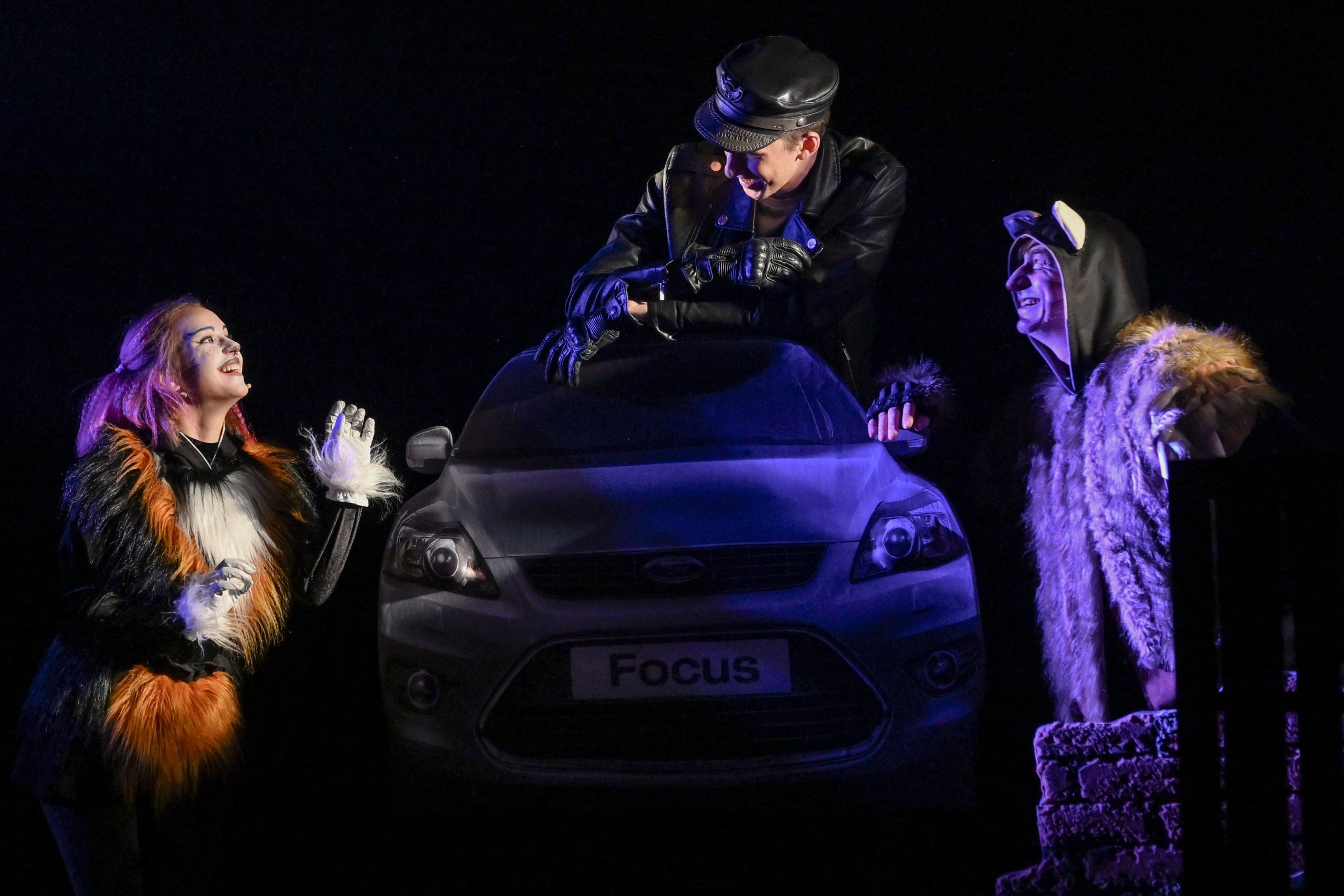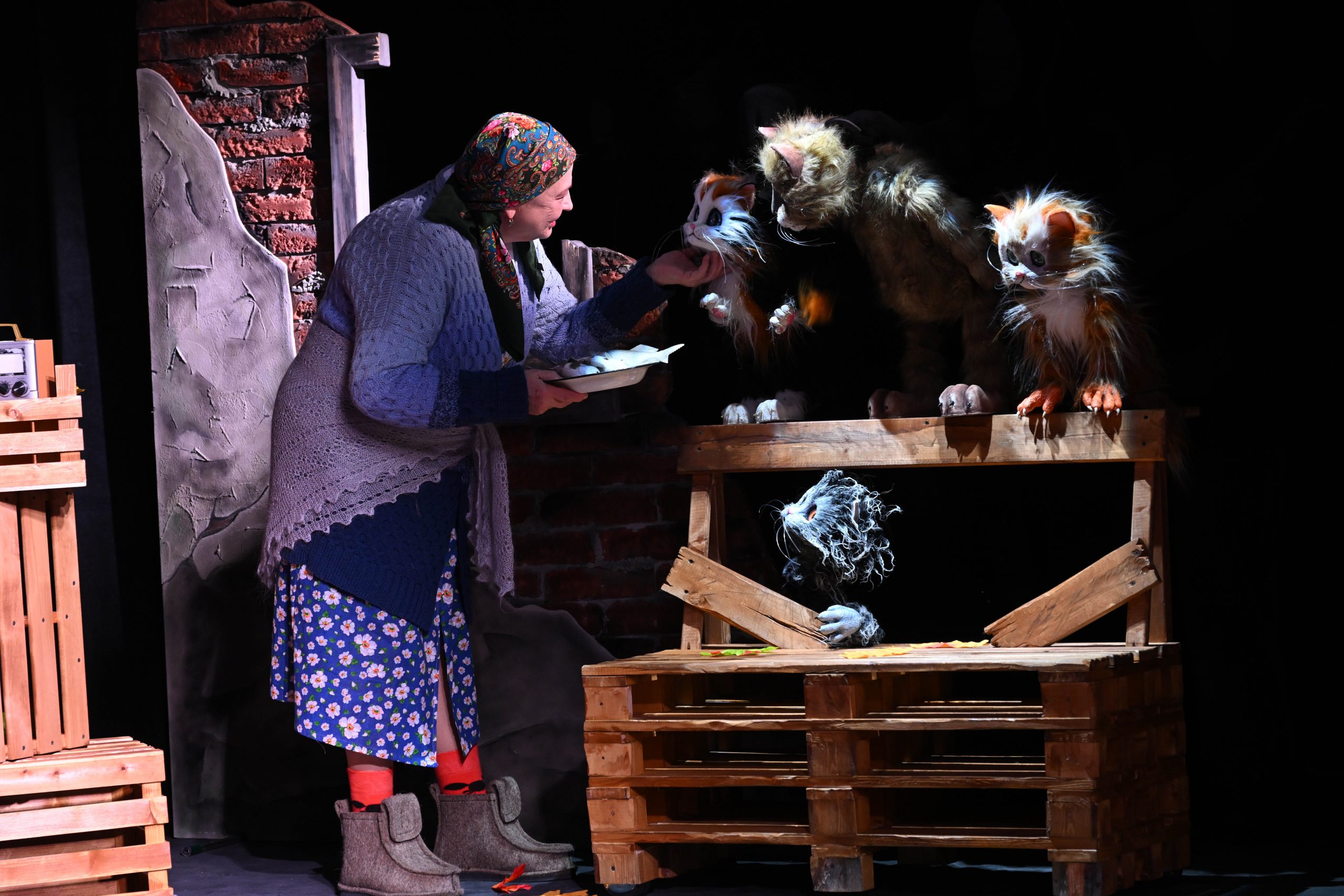 Кошек на сцене воплощают и куклы, и люди. В «живом плане» образы героев создали Юлия Ризак, Юрий Лесняк, Александр Титов, Фёдор Левантовский. Грим и костюмы для Одноглазого, Тощего, Рыжего и трёхцветной Новенькой создала художник-постановщик Евгения Орчикова.