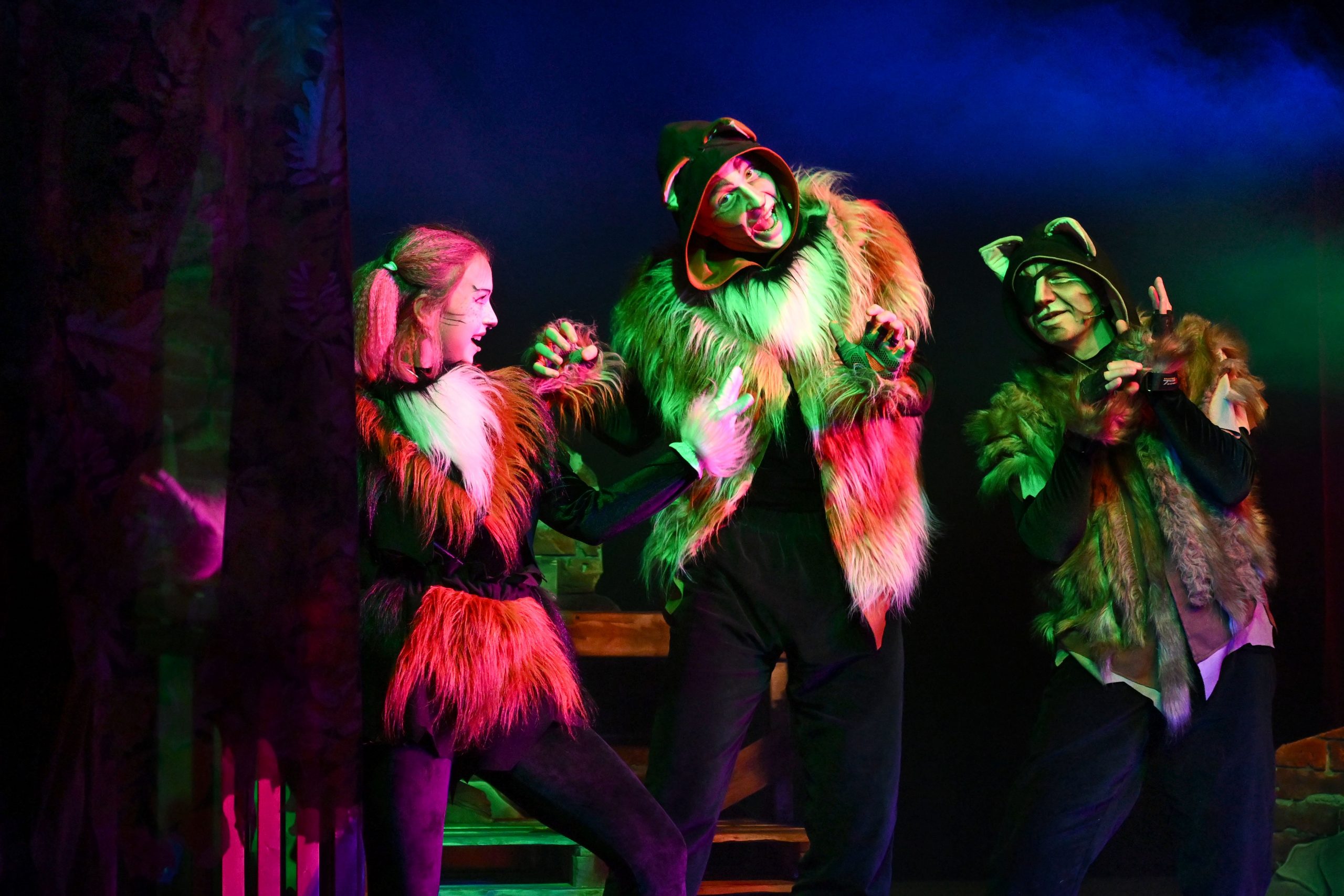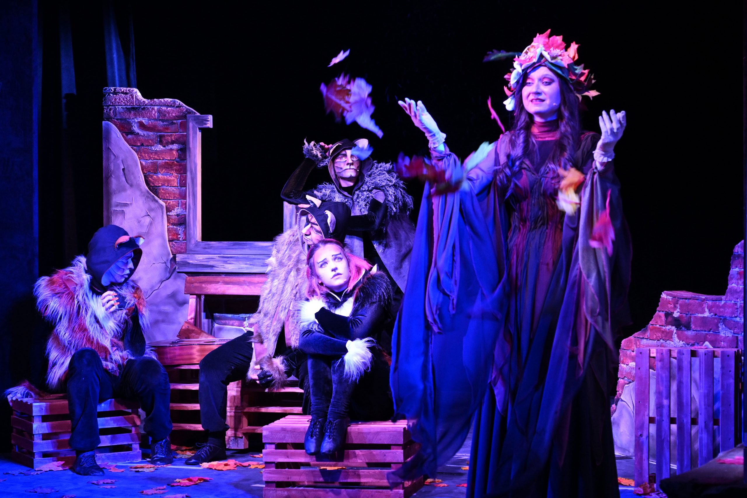 – Когда-то мы отдыхали в Мисхоре, – вспоминает Евгения. – Возле столовой часто видели кота. Он стал прототипом Одноглазого. Процесс работы над спектаклем был очень трудоёмким. Всё рождалось здесь и сейчас. Спектакль задумывался давно, но времени на реализацию всё равно оказалось мало. Необыкновенный кошачий взгляд помогли создать новые технологии. Особенно сложный костюм у Осени. Задача состояла в том, чтобы сделать дерево прозрачным. Вновь помогли новые технологии: напечатанные на ткани, а затем вырезанные разноцветные листья, кажется, только что облетели с ветвей. Кошачий грим был создан буквально накануне премьеры. Решили, что коты не должны быть «мультяшными». Это гордые животные, обитатели улиц!