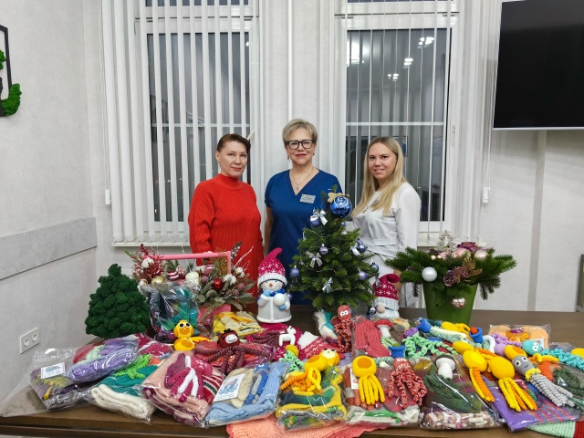 Волонтёры центра «28 петель» связали праздничные шапочки, носочки и игрушки.