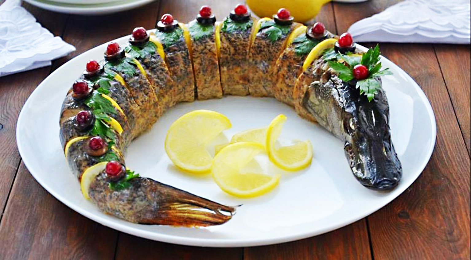 Вообще можно весь стол накрыть в историческом духе традиционной русской кухни. Холодные закуски – рыбное заливное и сальник. Подать его можно в виде канапе с соленым огурчиком. В качестве основных блюд – фаршированная щука, буженина с карамельной корочкой, гусь с тушеной квашеной капустой, в качестве гарнира вместо привычного пюре – картофельная бабка с беконом.