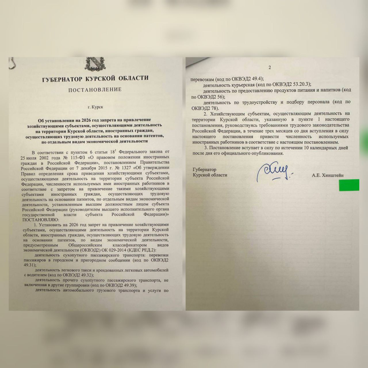 Губернатор Курской области Александр Хинштейн подписал постановление о запрете на работу иностранных граждан по патенту в ряде сфер с 2026 года. Новые ограничения коснутся нескольких видов услуг, связанных с непосредственной работой с людьми.