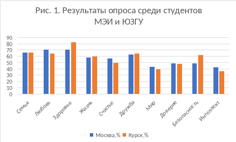 Семья оказалось одной из наиболее часто выбираемых позиций из списка 35 наименований от безопасности и богатства до свободы и денег. При этом семью выбрали 66,7 % студентов МЭИ (3 место в общем списке ценностей) и 66,4 % обучающихся ЮЗГУ (2 место). Результаты ранжирования подтверждают большую значимость ценности «семья»: студенты Первого Энергетического поставили семью на первое место, а курские студенты – на второе место после здоровья.