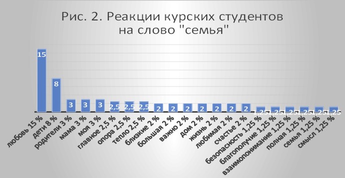 Также прошел свободный ассоциативный эксперимента. Фрагмент поля «семья», состоящий из реакций обучающихся ЮЗГУ выглядит следующим образом: любовь – 15 %, дети – 8 %, родители – 3%, мама – 3 %, моя – 3 %, главное – 2,5 %, опора – 2,5 %, тепло – 2,5 %, близкие – 2 %, большая – 2 %, важно – 2 %, дом – 2 %, жизнь – 2 %, любимая – 2 %, счастье – 2 %, безопасность – 1,25 %, благополучие – 1,25 %, взаимопонимание – 1,25 %, полная – 1,25 %, семья – 1,25 %, смысл – 1,25 %.