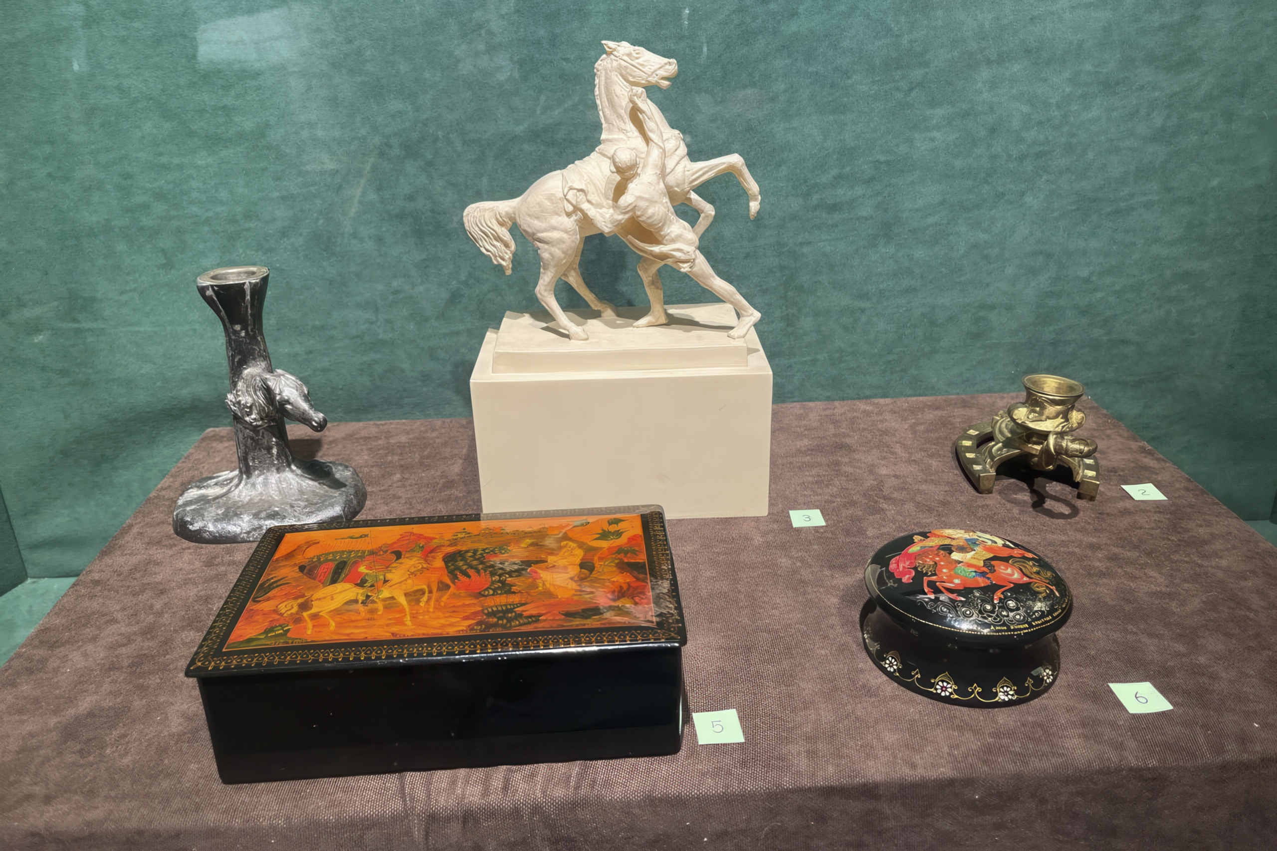 Отдельная витрина посвящена символическому значению лошади в древнерусской иконописи. Изображения лошадей встречаются на иконах, в разных сюжетах, связанных с образом святого Георгия Победоносца. Икона «Чудо Георгия о змие», «Чудо Димитрия Солунского со Спасом Нерукотворным и избранными святыми».