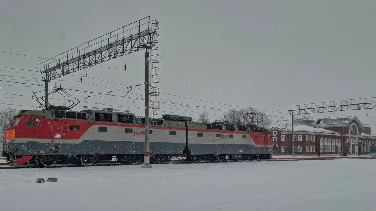 В Курской области в связи с ухудшением погодных условий и высокого риска наледи на линию вывели локомотив с вибропантографом. Устройство в ходе движения ударяет по проводу, чтобы разбить лед.