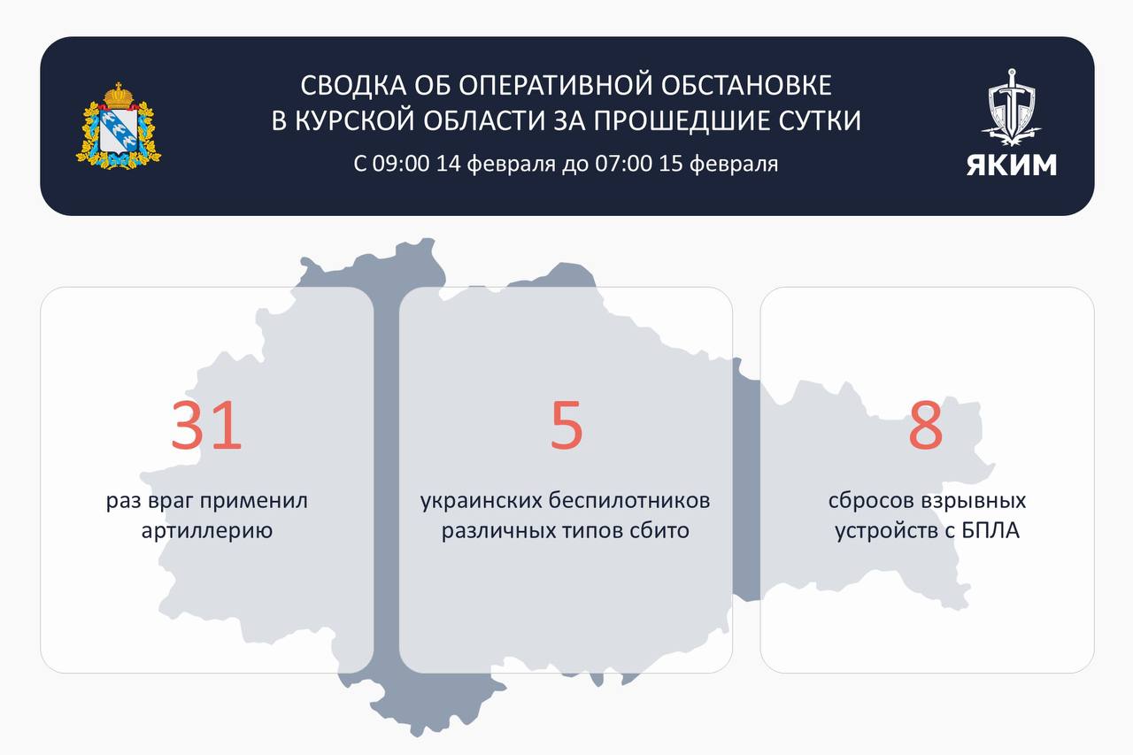 Как сообщил глава Курской области Александра Хинштейна, с 09:00 14 февраля до 07:00 15 февраля силы ПВО сбили 5 беспилотников различных типов.
