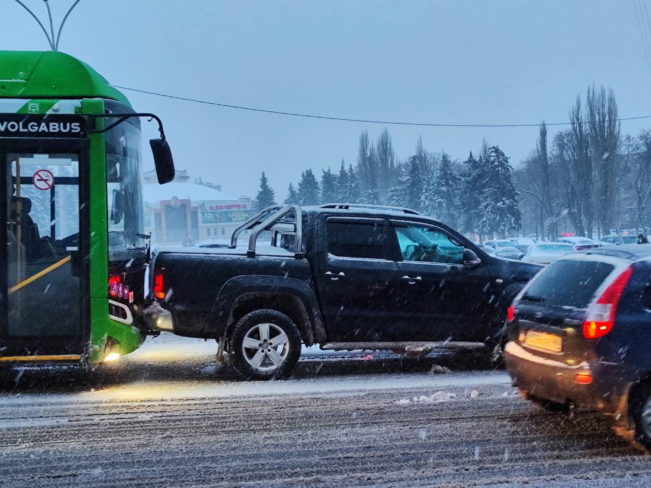 Ещё одна авария произошла в центре города Курска. «Волгобас» столкнулся с легковым автомобилем. Это уже вторая авария за вечер с участием общественного транспорта.