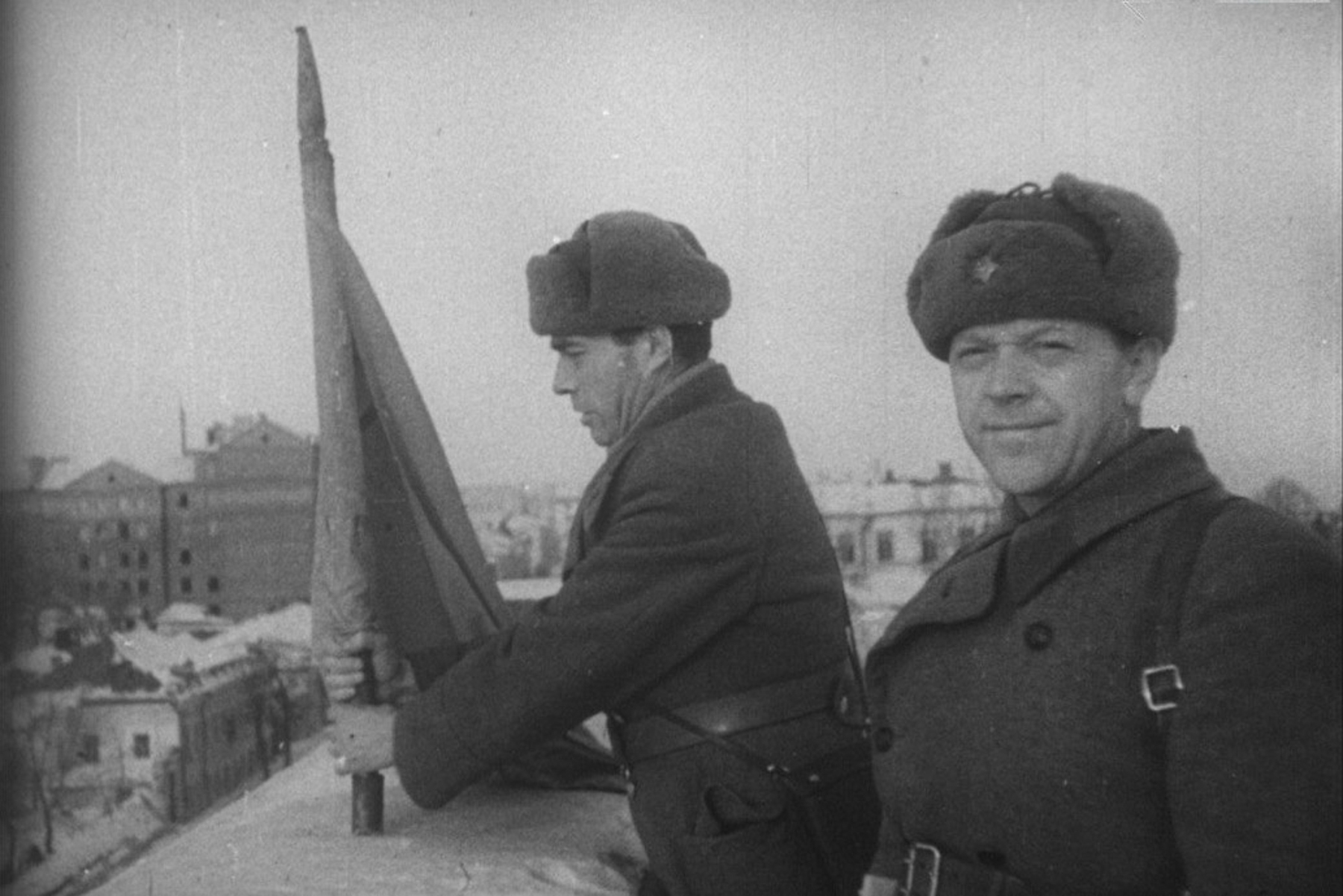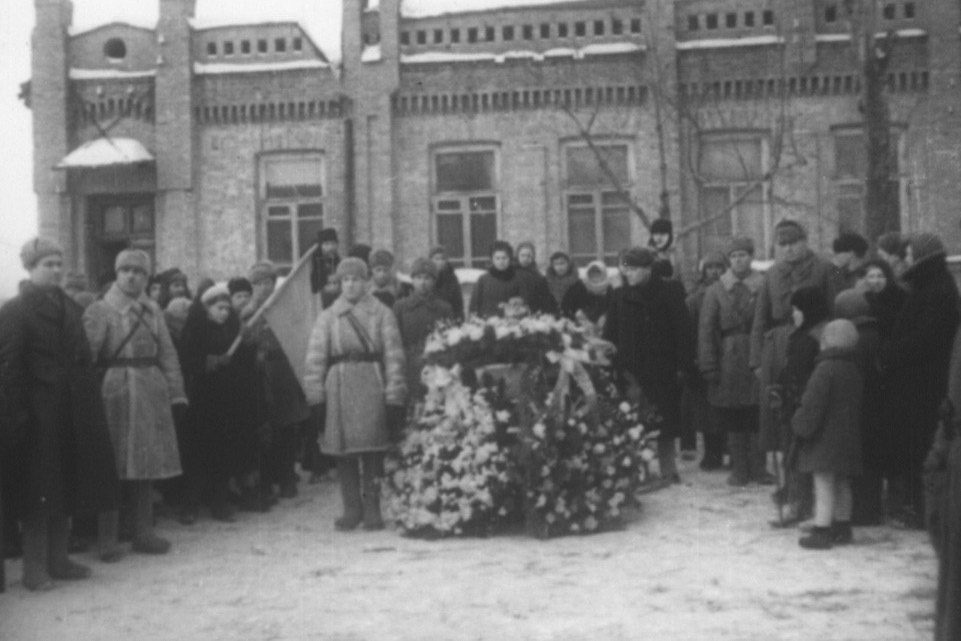 Леонтович снимает и центральные эпизоды в только что освобожденном городе. Водружение знамени – предположительно, 9 февраля 1943-го, и похороны Перекальского, командира 322-й стрелковой дивизии, блестяще показавшей себя на подступах к Курску при взломе обороны немцев.