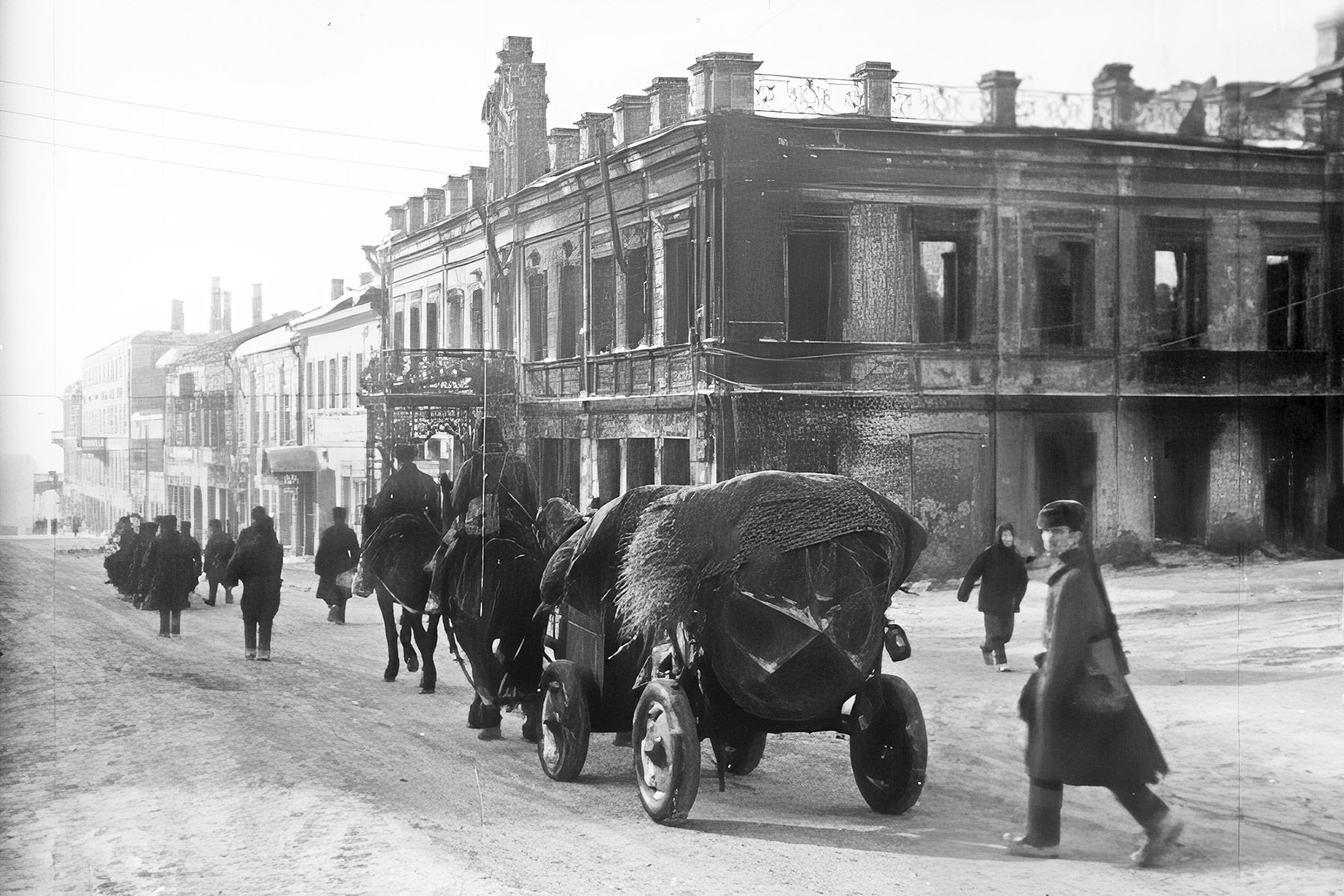 В центре внимания Вихирева прежде всего боль за разрушенный город. В этом смысле его материал отличается от работы Леонтовича.