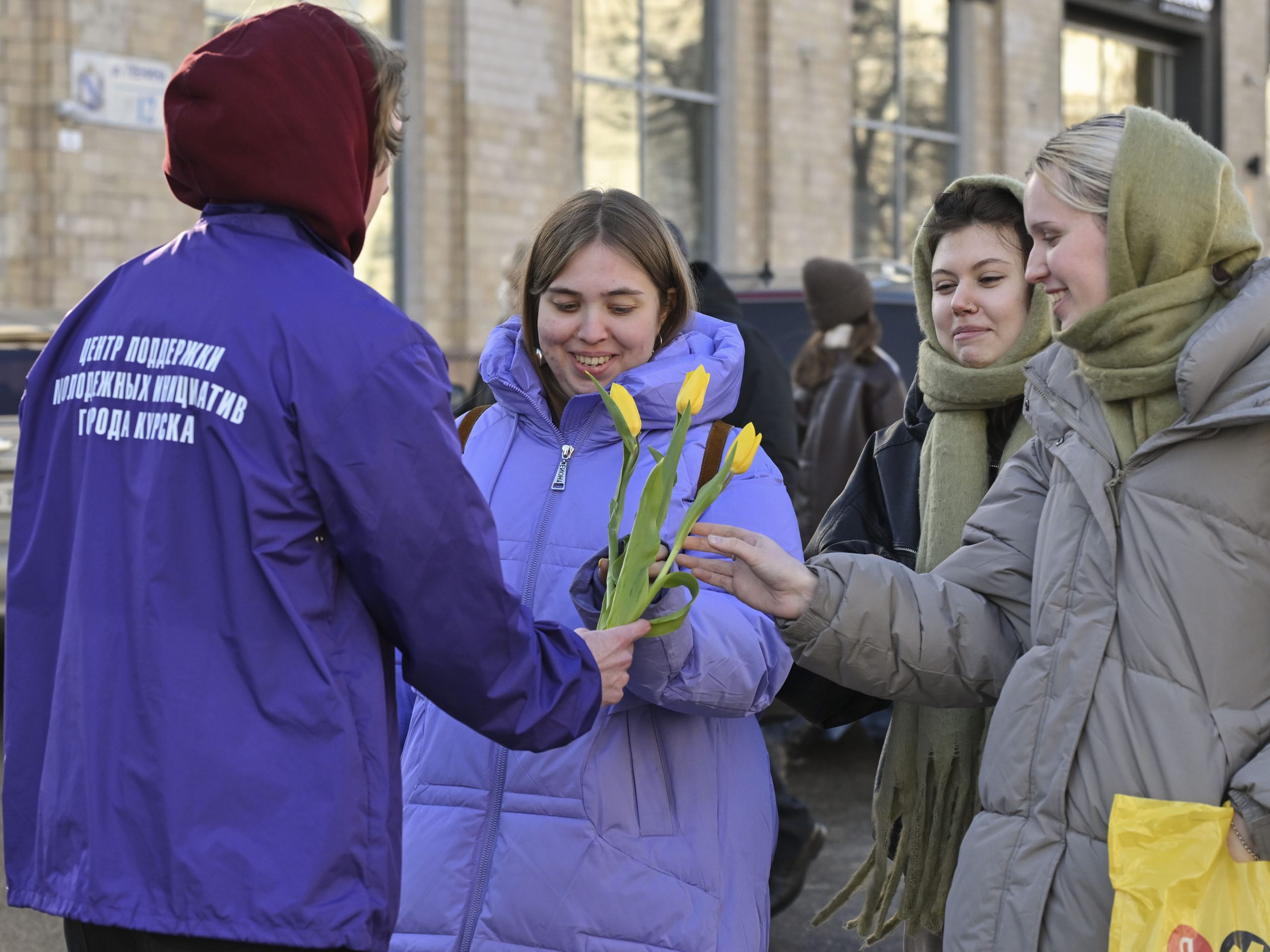 Волонтеры дарили курянкам тюльпаны и говорили самые теплые слова в канун праздника.