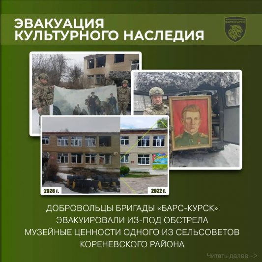 Добровольцы «БАРС-Курск» не только помогают обеспечивать правопорядок и борются с вражескими дронами, обеспечивают прикрытие аварийным бригадам энергетиков, доставляют гумпомощь мирным жителям, но и содействуют в сохранении культурного наследия. Из повреждённого артиллерией ВСУ здания сельсовета в Кореневском районе, они вывезли важные для истории и культуры экспонаты. Помещение сильно пострадало, и хранить музейные ценности там более было невозможно.