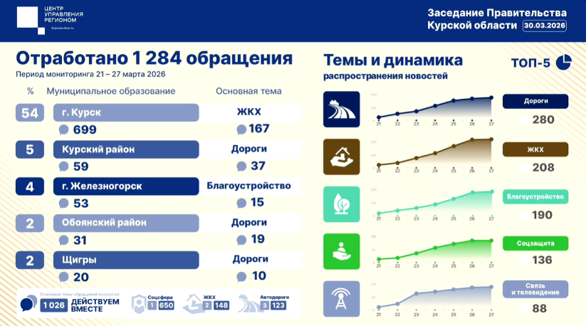 Около 20% всех обращений касались сферы ЖКХ. Жители жаловались на отсутствие холодной и горячей воды. Сообщения поступили из восьми муниципалитетов, чаще всего — из Курска.