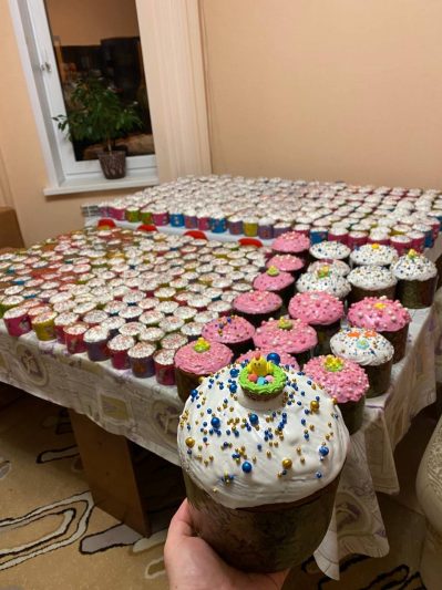 Для приготовления куличей нужны продукты. Так, волонтёрам требуется по 10 килограммов муки, сливочного масла и изюма, по 1 кило разрыхлителя для теста и ванилина, 50 литров молока, 10 кило сахара, по 5 кило сахарной пудры и кондитерской посыпки, 400 яиц, 20 кило кондитерской глазури.