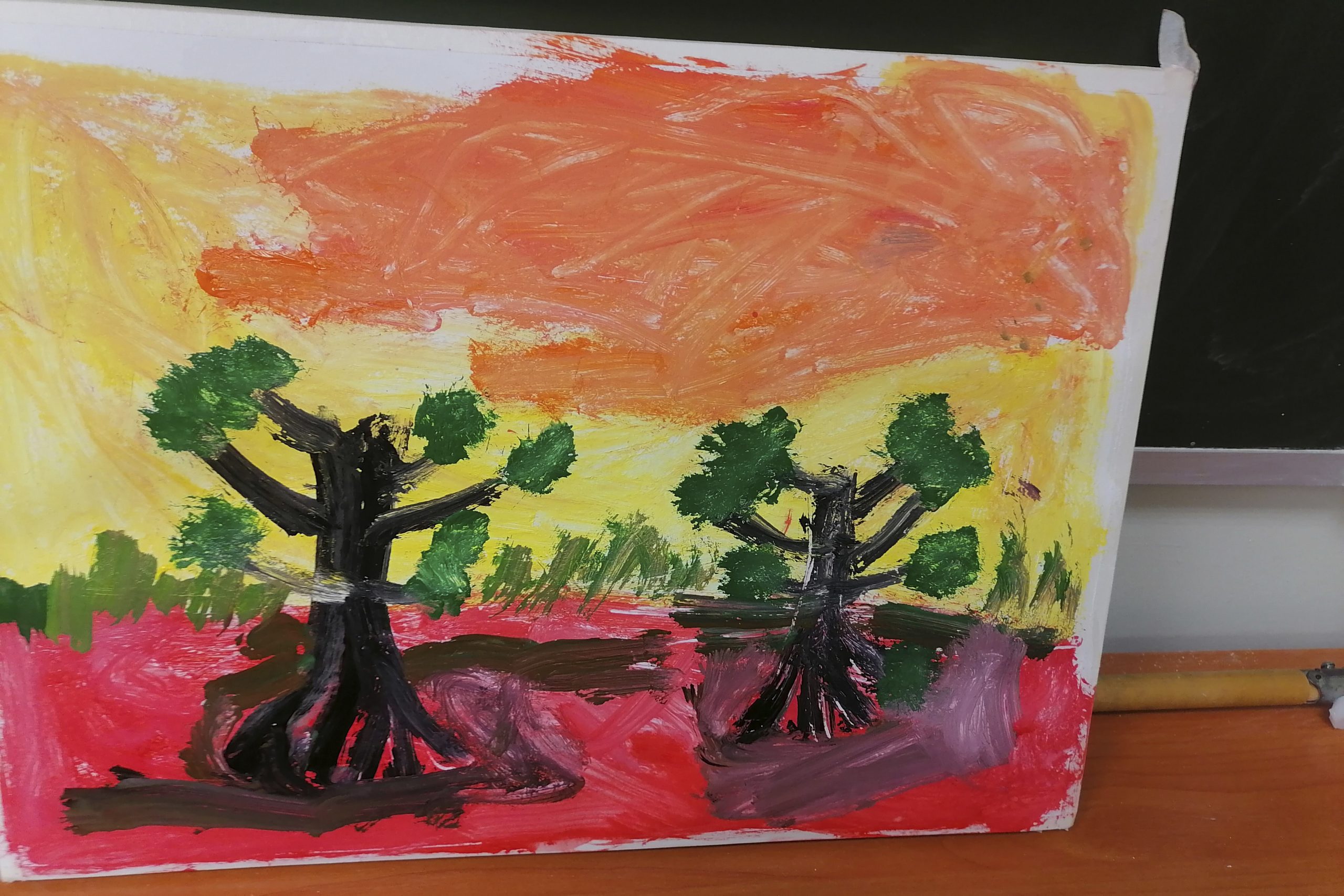 Перед Машей – другая, но тоже яркая. Жёлтая, красная, голубая гуашь на листе превращается в рассвет, но девочке этого мало. Она решает добавить что-то от себя. Деревья.
