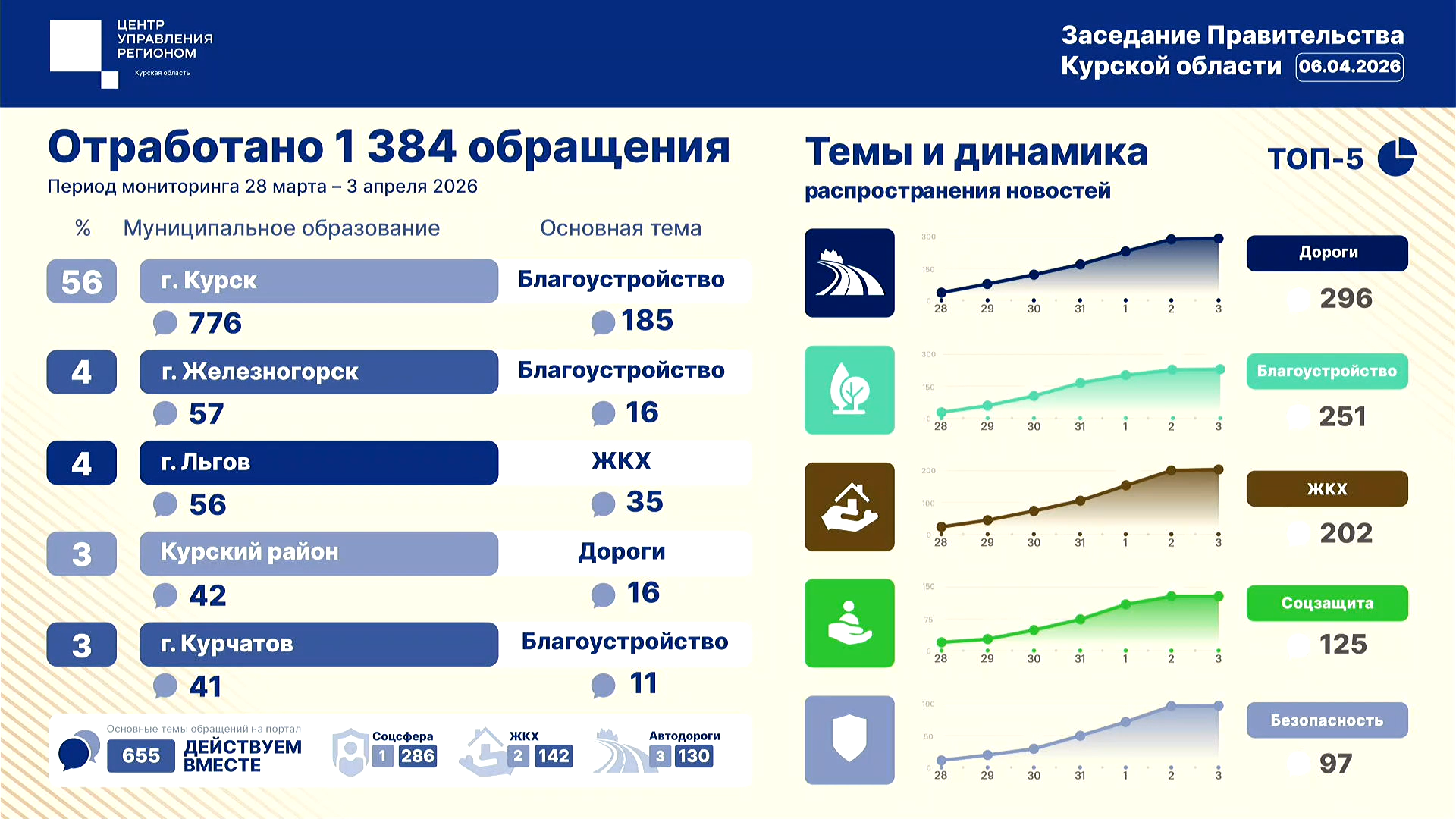 ЦУР Курской области за неделю обработал 1 384 обращения. Большинство обращений связано с проблемами дорог. Жители отмечают наличие больших ям, разрушенного асфальта, выбоин и колейности. Волнуют курян и вопросы благоустройства: аварийные деревья, несанкционированные свалки.