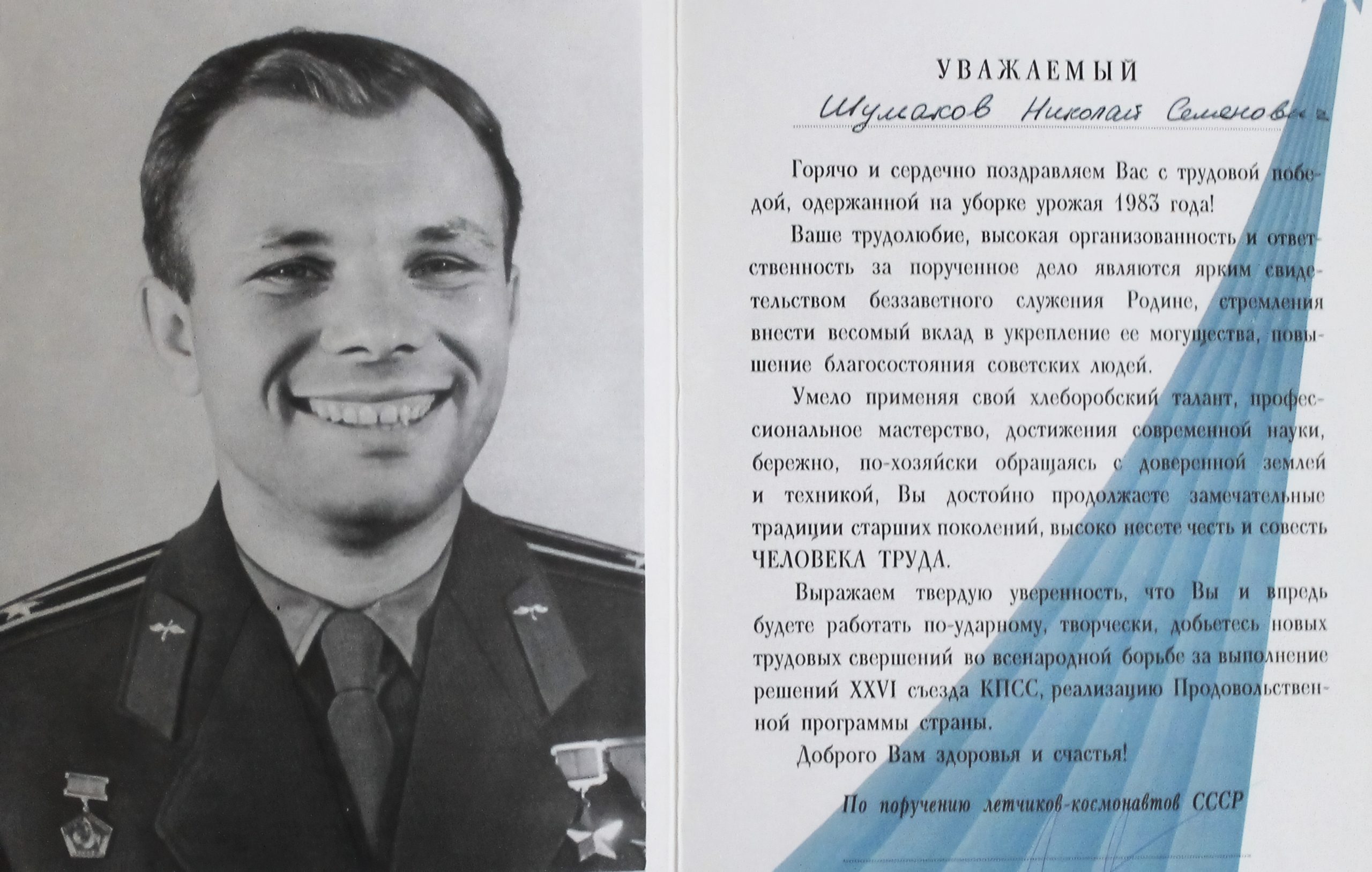 Гагарина уже не стало, а его образ оставался для жителей страны примером героизма и служения Родине. Труженик медвенского колхоза имени XXIII Партсъезда Николай Шумаков получил «Приветствие» от лётчиков-космонавтов СССР в связи с трудовой победой, одержанной в 1983 году. На реликвии улыбается светло Гагарин. Эту улыбку и сегодня знает и любит весь мир.