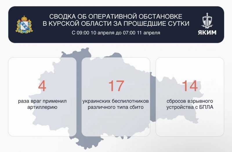 Сводку об оперативной обстановке в Курской области за прошедшие сутки опубликовал губернатор Александр Хинштейн. Всего с 9:00 10 апреля до 7:00 11 апреля враг 4 раза атаковал артиллерией по отселённым районам. 17 раз ВСУ ударили беспилотниками различного типа. 14 раз беспилотники атаковали регион с помощью взрывных устройств.