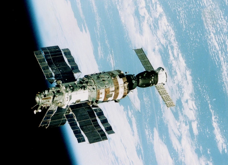 «Орбитальная станция Салют-7 с пристыкованным космическим кораблём Союз-Т». Фото из архива Виктора Савиных