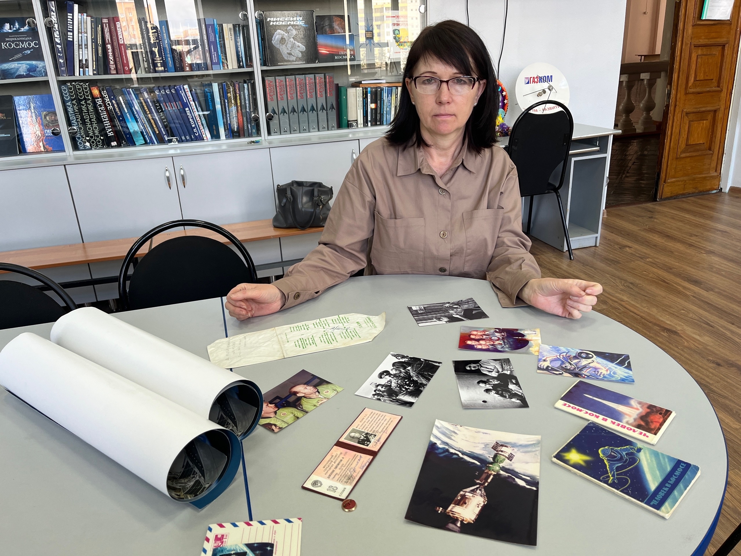 — Мы сделали передвижную выставку про Алексея Леонова, — делятся сотрудники. — Салфетка, автограф, фотографии.