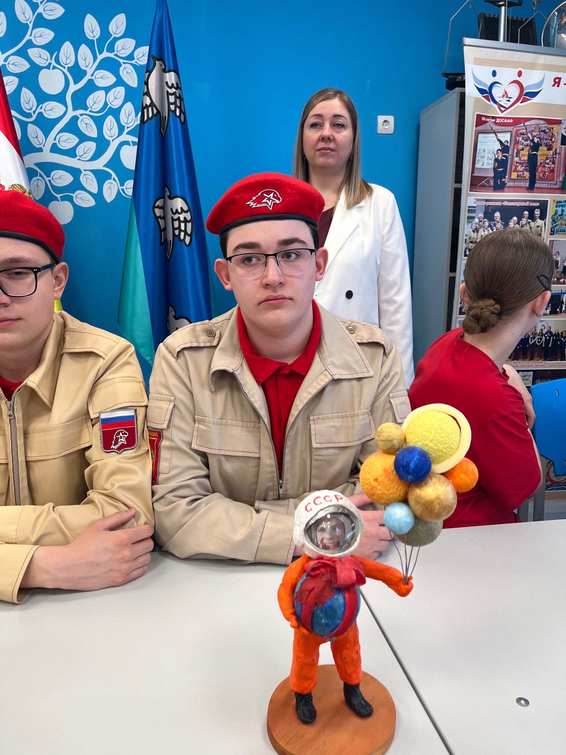 Школьники встретили космонавта аплодисментами и провели экскурсию по школе. Ученица 11 класса Настя Исакова вручила Горбунову памятный подарок — новогоднюю игрушку из ваты в виде космического снеговика.